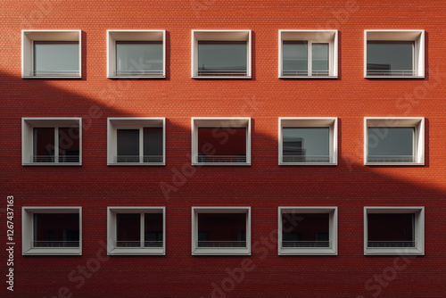 Fototapeta premium Building facade with window pattern and brick wall.