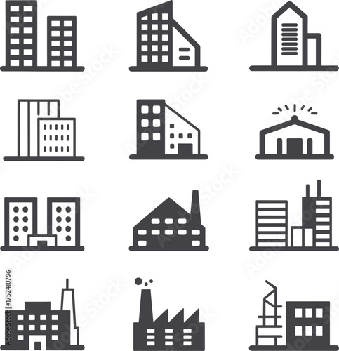 Obraz premium Building icons, modern architecture, city skyline silhouette, factory vector set, commercial real estate icons, urban structure symbols, black design elements