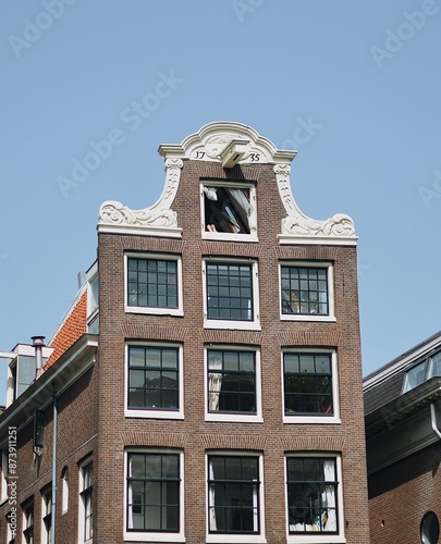 Fototapeta premium building in amsterdam with someone showing theitr feet in the window resting