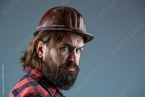 © Yevhen, Obraz premium Building, industry - builder concept. Bearded man worker with beard in building helmet or hard hat. Man builders, industry