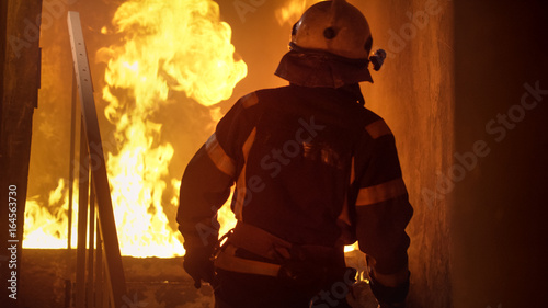 © Gorodenkoff, Obraz premium Building is On Fire. Fireman is Going Upstairs. Open Flames are Seen on Stairs.