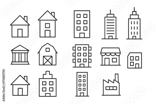 Fototapeta premium Building line icon set. Real estate and architecture symbols collection. Thin outline vector icons of house, home, office, skyscraper, bank, barn, factory and store. Editable stroke.