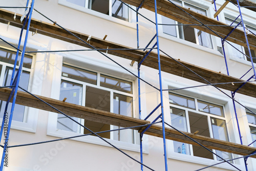 © Nariman, Obraz premium Building renovation in progress with scaffolding and workers preparing windows for installation