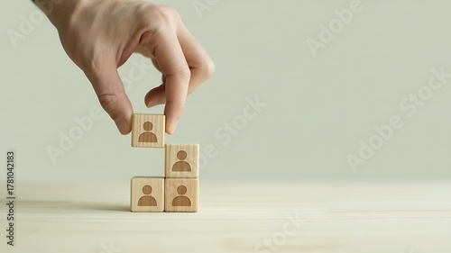 Obraz premium Building Team Hand Stacking Wooden Blocks with People Icons for Career Growth and Human Resources Management