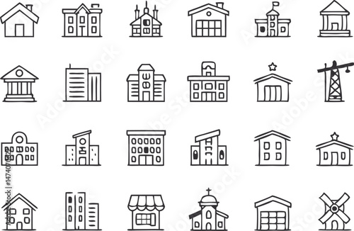 © MDMASUD, Obraz premium Building thin line icons set. Building, Architecture, House, Hospital, Office, School, Bank, Church, Hotel editable stroke icon. Vector