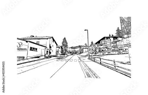 © dhanu3182, Fototapeta premium Building view with landmark of Laax is the municipality in Switzerland. Hand drawn sketch illustration in vector.