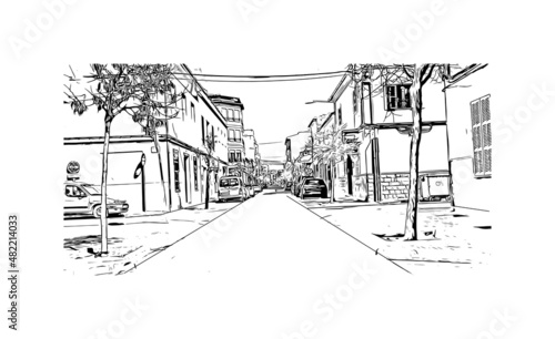 Fototapeta premium Building view with landmark of Manacor is the town in Spain. Hand drawn sketch illustration in vector.