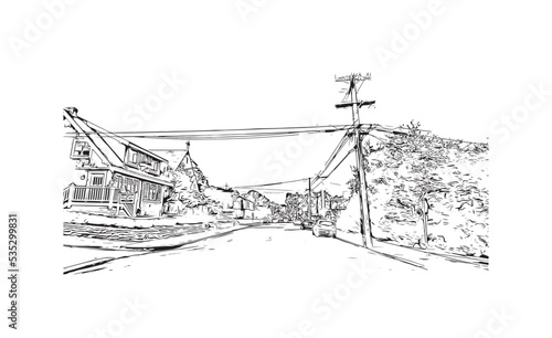 © dhanu3182, Fototapeta premium Building view with landmark of Pacific Grove is the city in California. Hand drawn sketch illustration in vector.
