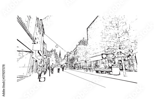 © dhanu3182, Obraz premium Building view with landmark of Preston is the city in England. Hand drawn sketch illustration in vector.
