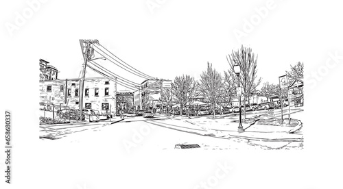 © dhanu3182, Fototapeta premium Building view with landmark of Saratoga Springs is the city in New York State. Hand drawn sketch illustration in vector.