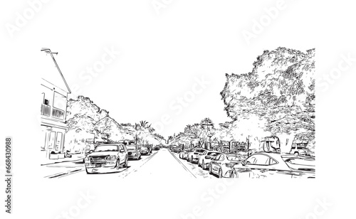 © dhanu3182, Fototapeta premium Building view with landmark of Siesta Key is a barrier island in Florida. Hand drawn sketch illustration in vector.