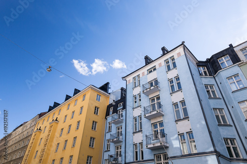 © photopixel, Fototapeta premium Building walls with windows on blue sky background