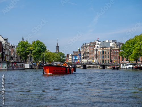 Obraz premium Buildings and boats along Amsterdam's beautiful canals in central Amsterdam during the day. The canals are one of Amsterdam's main attractions.