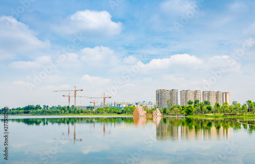 © Weiming, Naklejka premium Buildings and cranes around Jincheng Lake in Chengdu, Sichuan Province, China