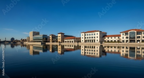 © Roro, Obraz premium Buildings reflected in a calm body of water under a clear blue sky.