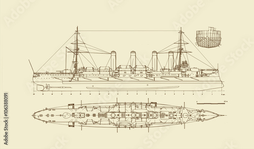 Obraz premium Built in 1903 old armored cruiser on a copymachine background. A great wall poster for a steam-punk-styled home office or an office of an engineering firm