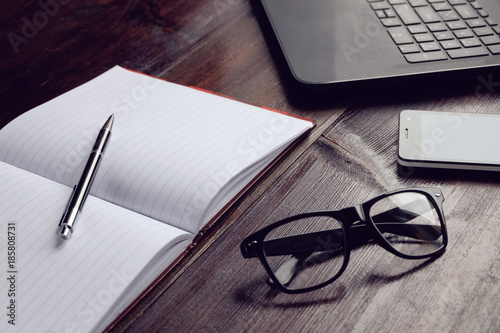 Fototapeta premium buisness set of laptop glasses smartphone and note book