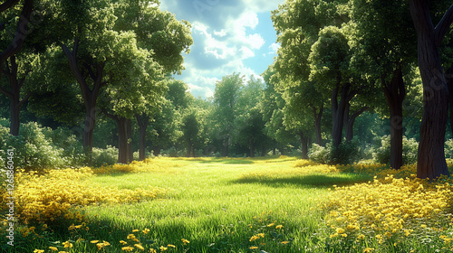 Obraz premium Bujna zielona łąka z żółtymi kwiatami otoczona drzewami w słoneczny dzień w...