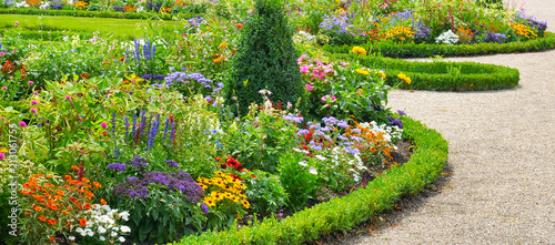 © alinamd, Obraz premium Bujne kwietniki w letnim ogrodzie. Duże zdjęcie.
