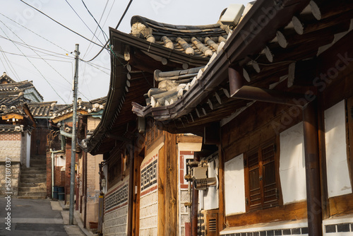 Fototapeta premium Bukchon Hanok Village Korean traditional village in Seoul during winter afternoon at Jongno-gu , Seoul South Korea : 7 February 2023