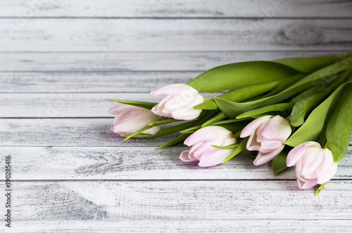 © Bea, Naklejka premium Bukiet różowych tulipanów na drewnianym stole