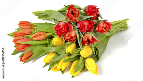 © Jolaya, Naklejka premium Bukiety tulipanów w różnych kolorach z liśćmi