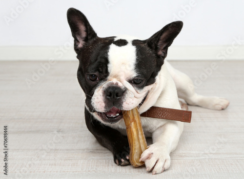 © Africa Studio, Fototapeta premium Buldog francuski z kością w pokoju