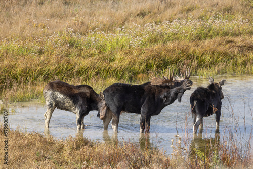 Naklejka premium Bull and Cow Moose During the Rut in Autumn in Wyoming