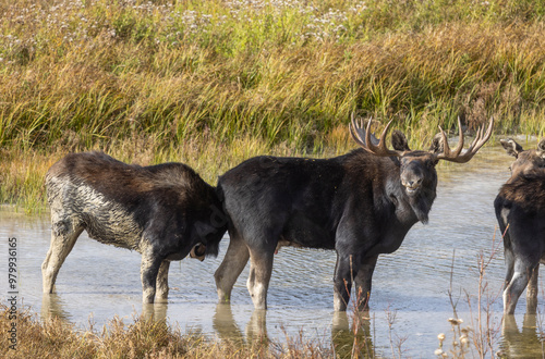 Naklejka premium Bull and Cow Moose During the Rut in Autumn in Wyoming