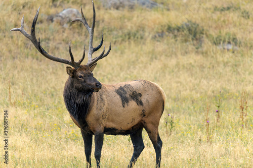 © Sean Xu, Fototapeta premium Bull Elk - A close-up side view of a strong mature bull elk standing and grazing in a mountain meadow on a late Summer evening. Rocky Mountain National Park, Estes Park, Colorado, USA.