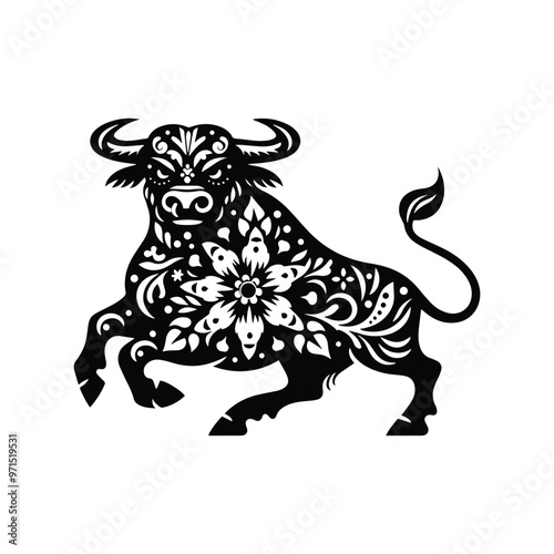 Obraz premium Bull in folk art black and white silhouette illustration
