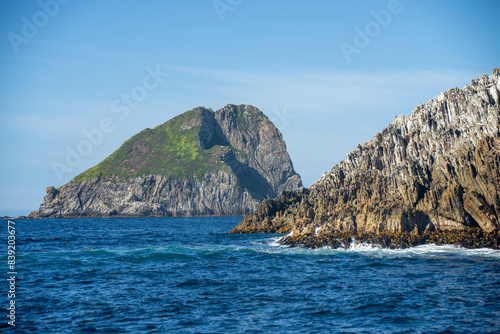 Naklejka premium Bull kelp seaweed growing on rocks around an island in australia with waves breaking over it in the ocean in australia