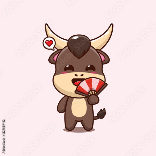 Obraz premium bull mascot cartoon character vector illustration with hand fan