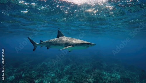Fototapeta premium Bull shark in ocean waters near reef, illustrating marine predator activity,...