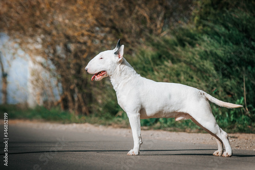 © Evelina, Obraz premium Bull terrier show dog posing. Dog portrait outside.