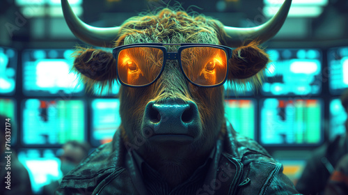 © weerasak, Obraz premium bull wearing sunglasses and a leather jacket, standing in front of a stock market data display