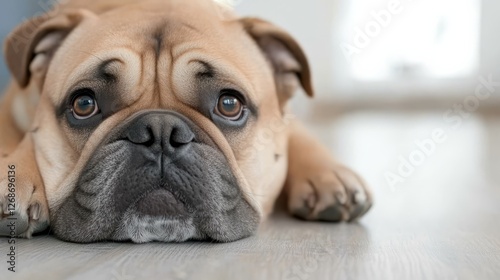 © Aleksandra, Fototapeta premium Bulldog sitting on the floor in front of a kitchen area with copy space.