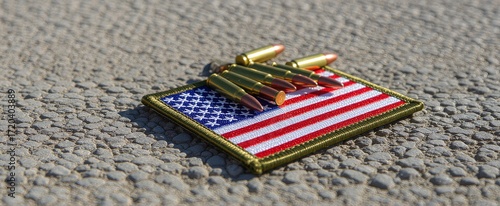 Fototapeta premium Bullets resting on an American flag patch on a textured surface.
