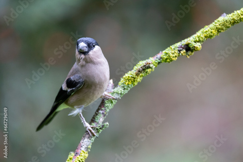 Fototapeta premium Bullfinch female (pyrrhula pyrrhula) perched on a green branch, with a...