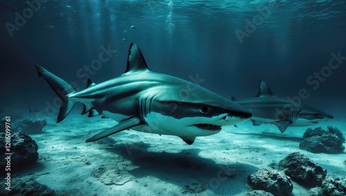 Fototapeta premium Bullsharks are observed gliding toward the ocean floor.
