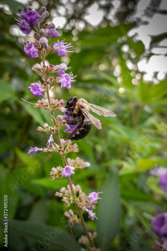 © Sarah Kru, Fototapeta premium Bumblebee drinking nectar from a wild flower