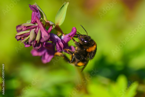 Fototapeta premium Bumblebee drinking nectar from purple flower Corydalis cava