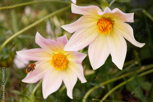 Fototapeta premium Bumblebee flies to white clematis