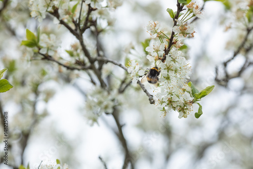 © Ирина Краснова, Fototapeta premium Bumblebee on plum tree flowers, pollination