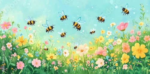 © NArts, Obraz premium Bumblebees Flying Over A Colorful Wildflower Meadow