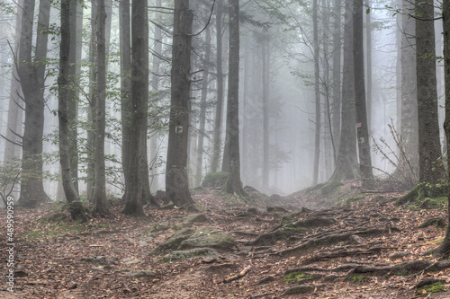 Obraz premium Bumpy hiking trail through the misty Bavarian Forest..