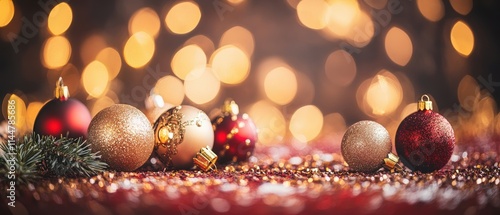 © Chayakorn, Fototapeta premium Bunch of Christmas ornaments are scattered on a red background. Banner