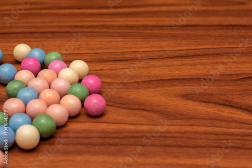 © Lukasz Jasionowski, Obraz premium Bunch of colorful candy on a wooden table