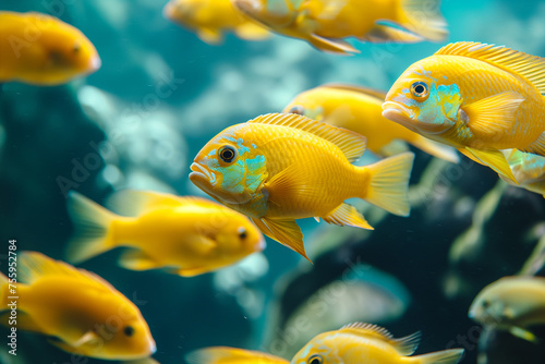 © Ishra, Naklejka premium Bunch of Electric yellow cichlids in the sea, African cichlids (Malawi Peacock), group of yellow small fish, metallic blue gray cichlids in freshwater, Haplochromis obliquidens, fish wallpaper concept