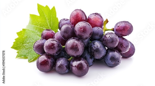 Obraz premium Bunch of fresh purple grapes with dew drops and green leaves on a white background showcasing natural fruits and healthy snacking options